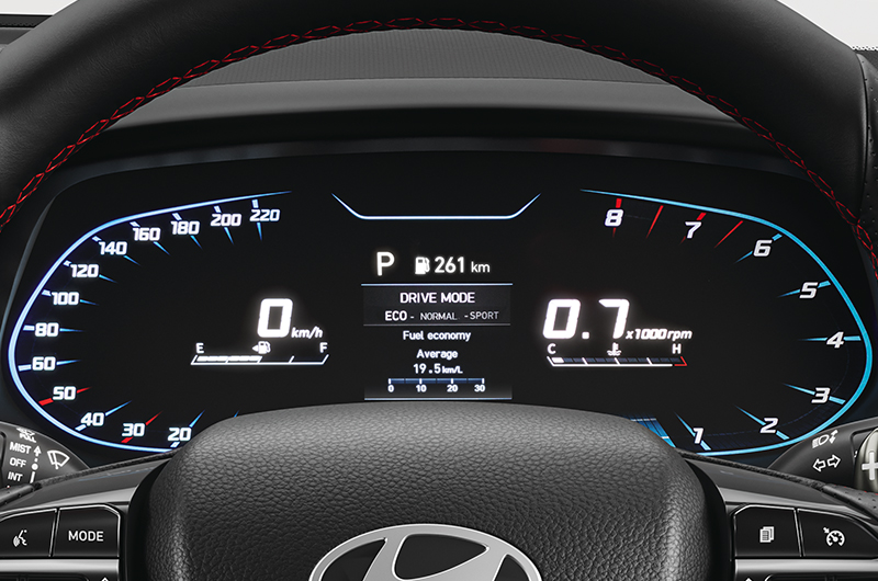 As you step into the cockpit of the new Hyundai i20 N Line you’re graced by the sleek design that’s packed with technology. The iconic N badging on the steering wheel, leather wrapped gear knob, and the seats, along with the all black interiors with red inserts add to the sporty appeal.